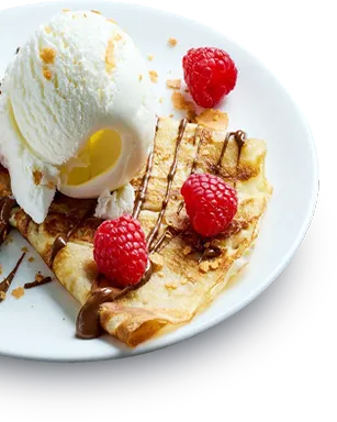 TWO LAYERS OF CREPES* FILLED WITH NUTELLA* BANANA STRAWBERRY* KIWI WHIPPED CREAM VANILLA* CHOCOLATE AND STRAWBERRY ICE CREAM* POWDERED SUGAR* CARAMEL* CHOCOLATE SYRUP